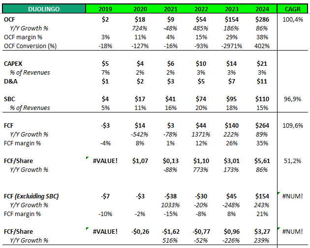 En este tipo de empresas de software y efectos red se invierte a través de OPEX, no CAPEX, por eso la generación de caja siempre suele ser mayor. No solo por un CAPEX muy bajo, sino porque además viene combinado con un working capital negativo, que adelanta la obtención de caja antes de reconocer las ventas. A esto se le llama Bookings. Mucha gente compra una suscripción del año completo para Duolingo; la empresa recibe la caja, pero no puede reconocer la venta hasta que presta el servicio (working capital negativo).