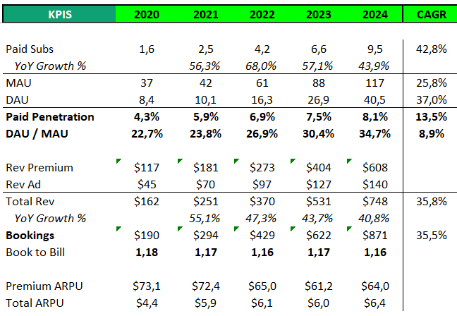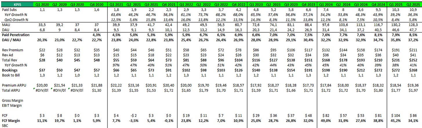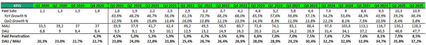 De ahí la importancia capital de que esta cifra siga creciendo, no tanto los MAU (monthly active users), sino los Paid Subs. Podemos ver su evolución anual (YoY) o trimestral (QoQ). Si queréis la cifra anual de todo esto, quedaos con la del Q4 de cada año.