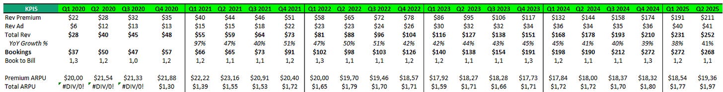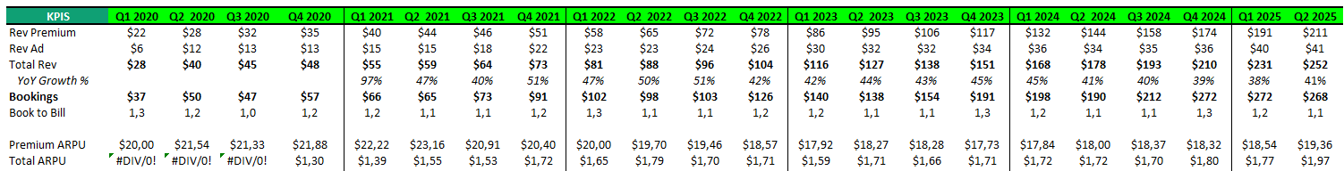 Al final, los KPIs anuales son estos. No los tenía así, pero os los construyo, que para eso estamos. Vemos claras mejoras en todos, salvo en el Book To Bill, que se ha mantenido prácticamente igual todos estos años, y en el ARPU, que ha bajado a pesar de haber incrementado la penetración de usuarios de pago, cosa que me extraña.