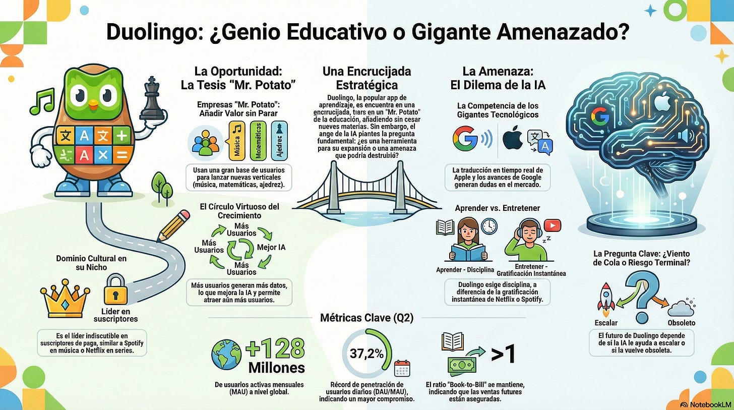 Creo que la pregunta que tiene que contestarse cada uno, puesto que creo que de momento no hay una respuesta real, es si la IA es la oportunidad para Duolingo de escalar y conquistar cualquier vertical relacionada con la educación, o si es un riesgo de valor terminal. Es la diferencia entre valer varios billions o 0$.