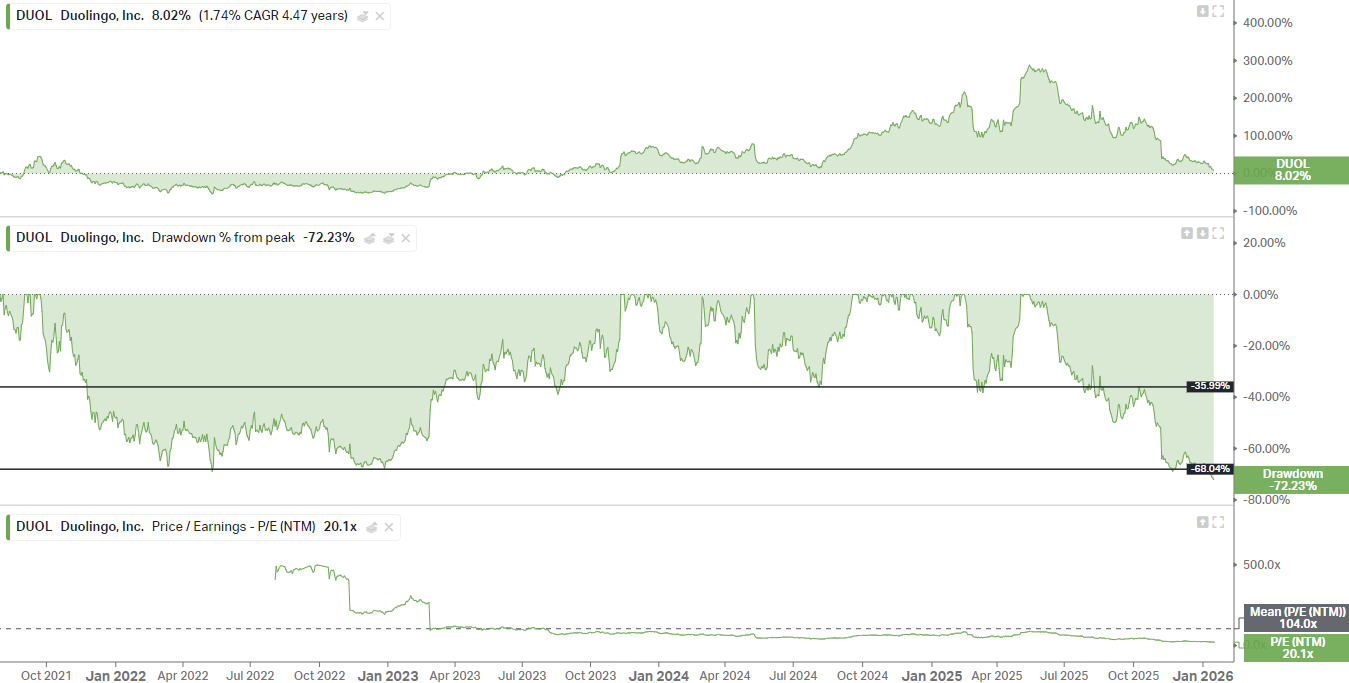 Duolingo se encuentra ahora en una caída histórica y el precio de la acción se sitúa en los mismos niveles que cuando hizo la IPO en 2021.
