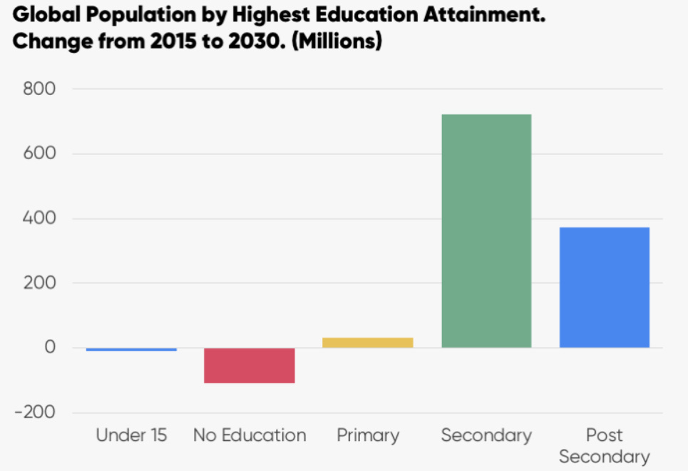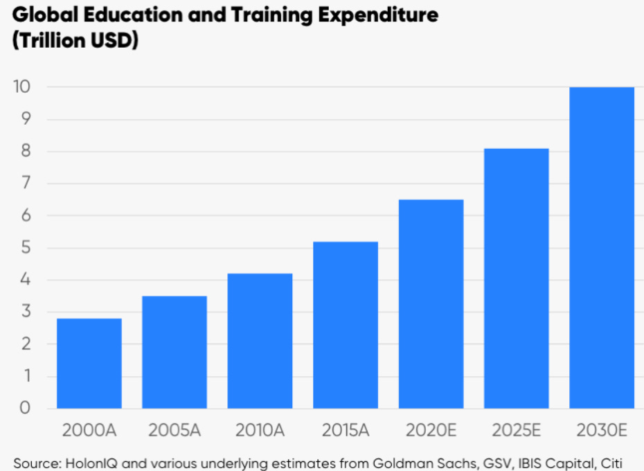 El mercado de la enseñanza es masivo; se calcula que para 2030 superará los 10T$, impulsado por la educación en países en vías de desarrollo.