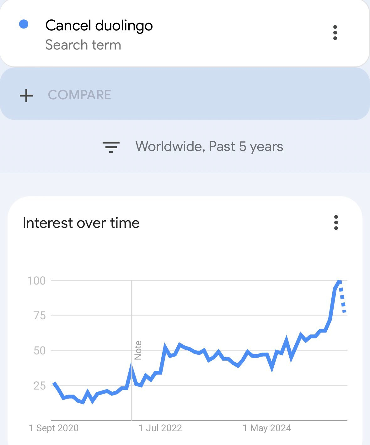 Su actual retención y crecimiento de clientes de pago (y no de pago) es sin duda impresionante. Pero el único problema fundamental que personalmente tengo con $DUOL es la esencia de su producto: el aprendizaje. Y aprender requiere disciplina y paciencia. Eso es lo opuesto a cómo funciona la mayoría del comportamiento del consumidor. La pérdida de peso es una analogía perfecta. Todos quieren el resultado, pero muy pocos perseveran en el proceso.