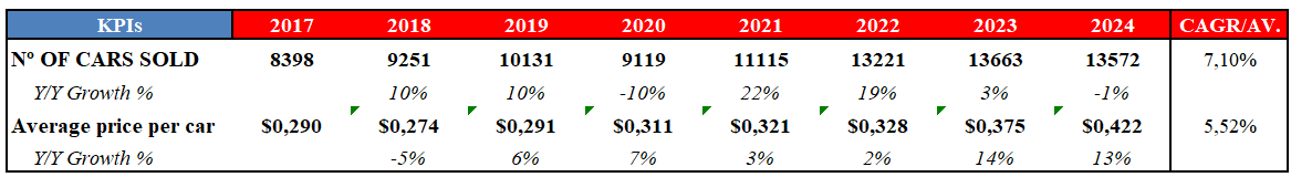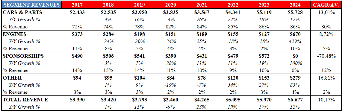 Fijaos cómo los dos últimos años han vendido un +3% de coches en 2023 y un -1% en 2024 y aun así, las ventas del segmento crecieron un +18% y un +12% respectivamente. Simplemente brutal.