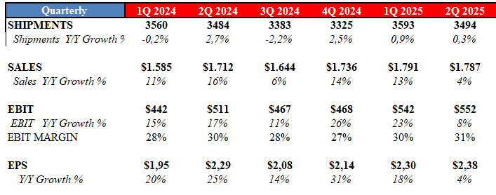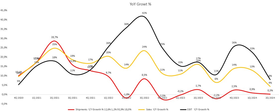 Lo mejor es que llevan con esta dinámica muchos trimestres. Fijaos a qué ritmo crece cada métrica. En el trimestre anterior, sin ir más lejos, +0.9% en envíos, +13% en ventas y +23% en EBIT.